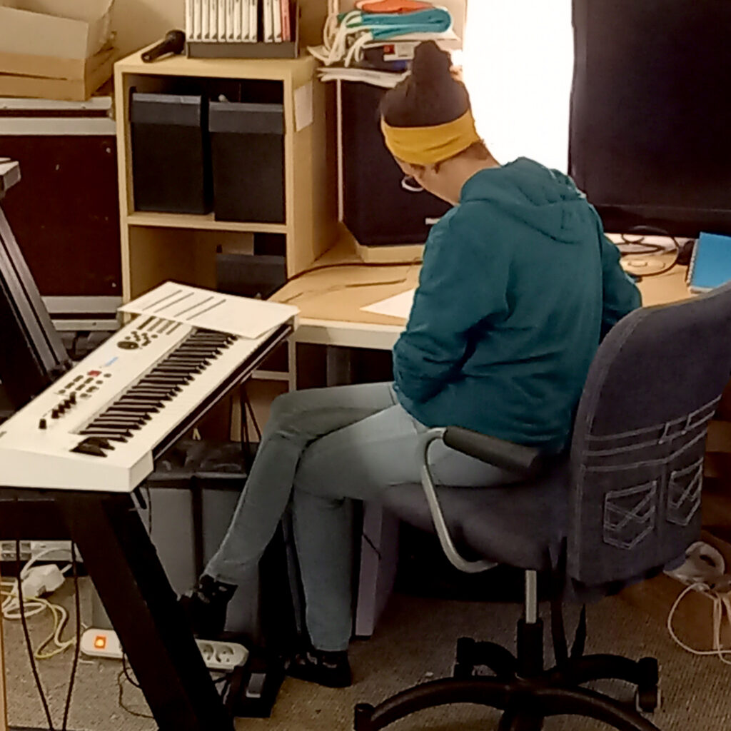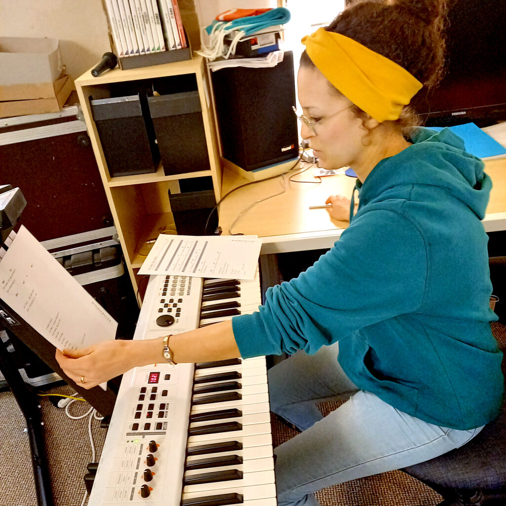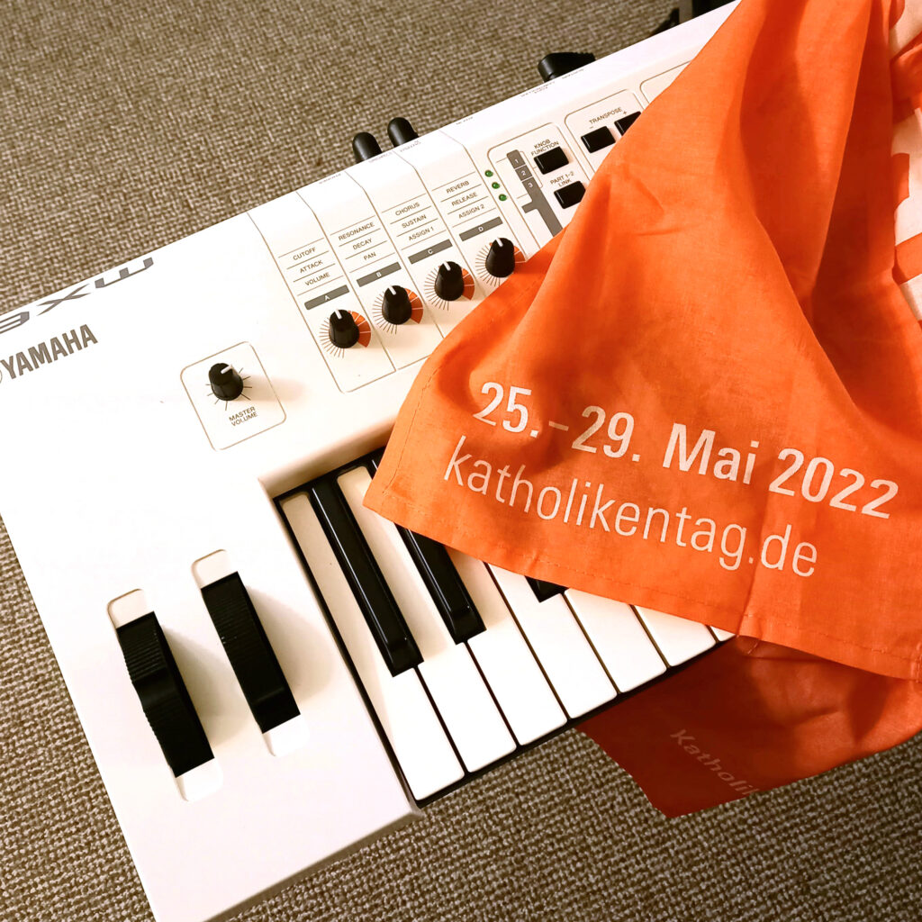 Dem Song, den Matthias zum Katholikentag mitbringen wollte, fehlte in einer der Proben vor der Veranstaltung noch eine Strophe. Durch eine Verwechslung der Uhrzeit des Beginns der Probe kam unsere Sängerin Sanne zu früh zu Matthias, wo sie zur Abfahrt verabredet waren. Da Matthias noch das Auto beladen musste, beauftragte er kurzerhand Sanne, die fehlende Strophe zu ergänzen – was dann auch wunderbar geklappt hatte. Hier ein paar Schnappschüsse aus dieser Mini-Liederwerkstatt. Einen Rückblick in Bildern von unserem Katholikentag in Stuttgart gibt es auf dieser Seite.